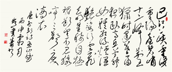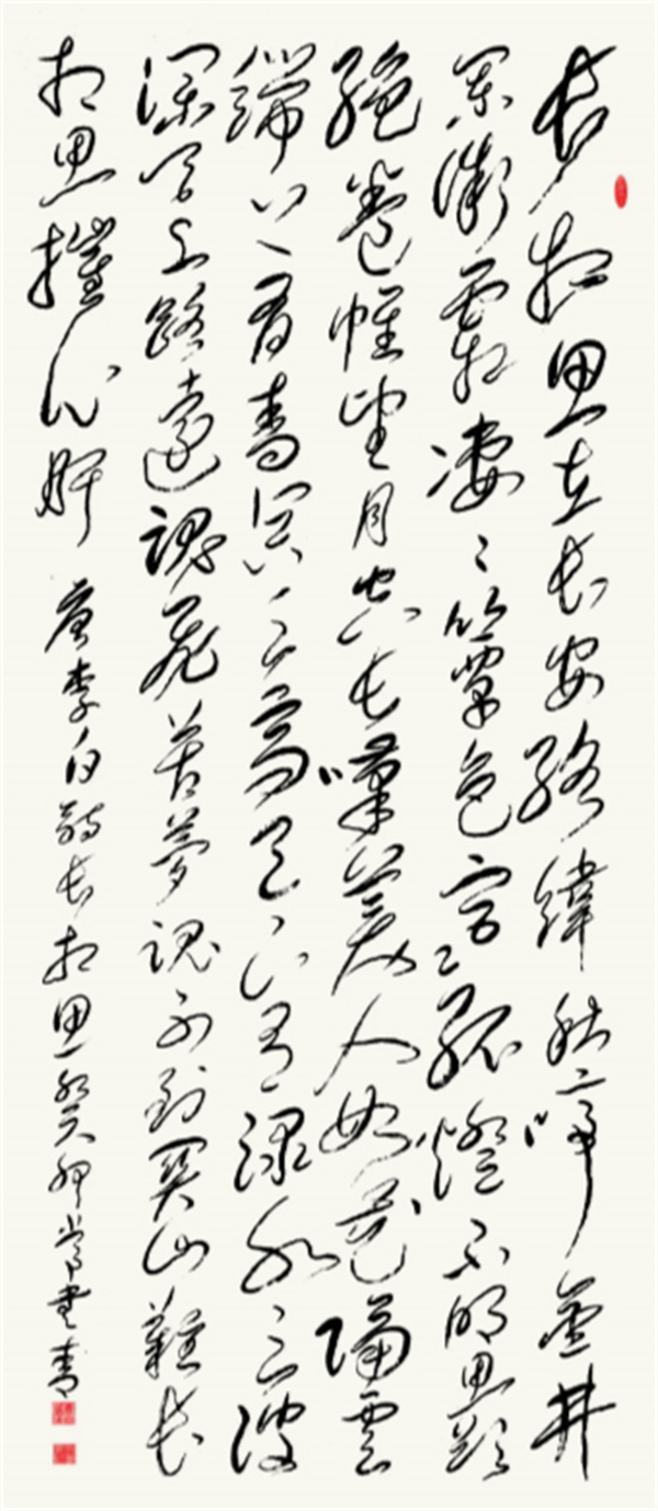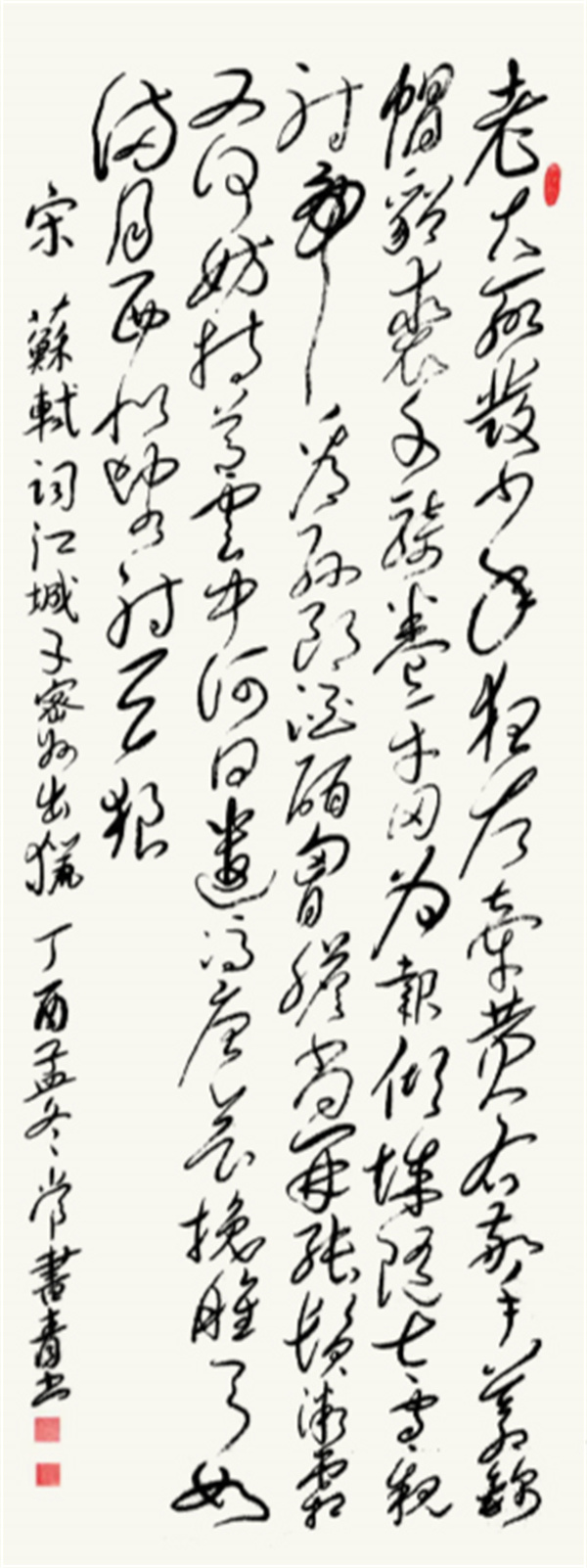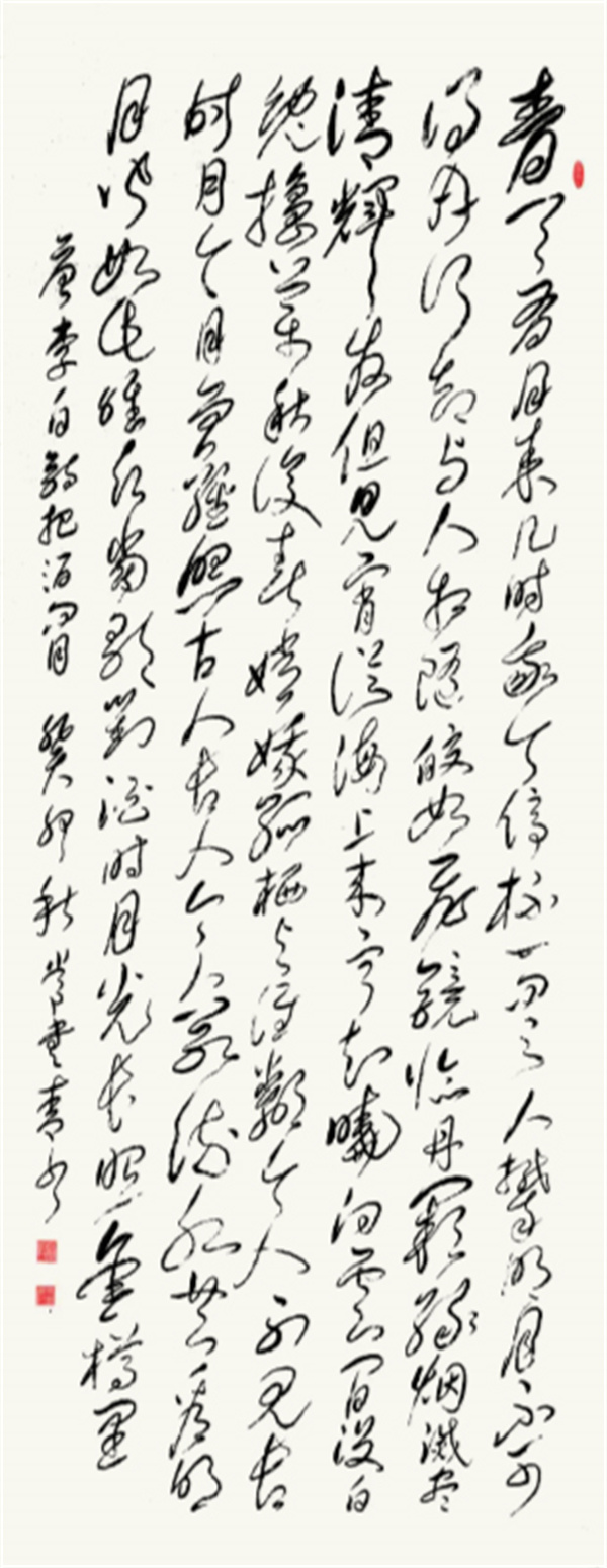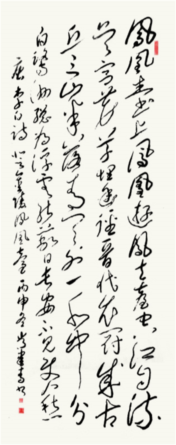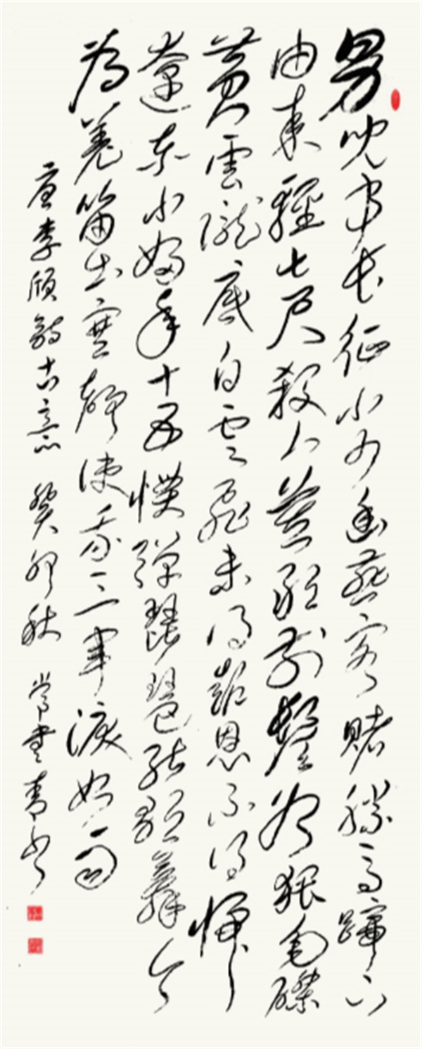 其草书不取狂怪之姿,而于 “几微要妙” 中见从容 —— 线条 “字外出力中藏棱”,章法 “随形布势、虚实相生”,既合张怀瓘 “草则行尽势未尽” 之论,又暗契朱熹 “不与法缚,不求法脱” 的从容。这种 “质朴无华” 的气质,恰是他以古为新的注脚:师汉碑而不泥其形,法晋唐而能出己意,让千年笔法在当代语境中生长出 “古树新花” 的生机。