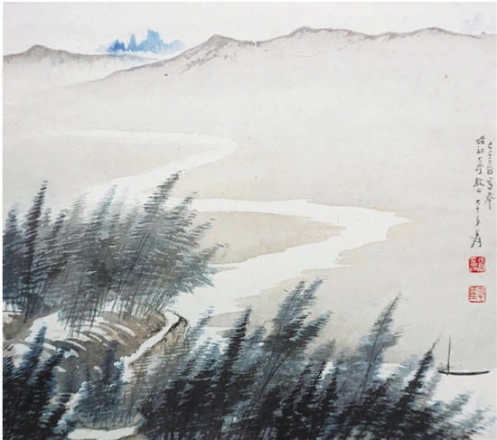 清初书画鉴藏家笪重光在《画筌》谈道:“空本难图,实景清而空景现。神无可绘,真境逼而神境生。位置相戾,有画处多属赘疣。虚实相生,无画处皆成妙境。”是中国山水画造境的经典妙法。作品神韵是无法直接描绘出来的,只有当真实的情境描绘得逼真时,神韵才会自然产生。在绘画中的虚实相生,无画的部分也能构成美妙的境界,笔墨未到的空白处,是影响画作整体效果的重要因素。纵观中国传统绘画理论发展脉络,不难发现“留白”的艺术表现已然成为中国画重要的构图法则和审美特征,至明清时期成为成熟的创作法则。《芦苇图》笔墨精练,留白处理巧妙,近景为芦苇坡岸,中景为水径、河滩,远景为山峦,近、中、远景之间相互映衬。在笔墨施用上,张大千取细笔淡墨,近景处芦苇复以重墨勾写,芦苇随风微动,既与中、远景拉开空间层次,也突出画面的意境。中景水径的留白,远山仅数笔勾写山头,呈现出缥缈苍茫之气。全画色调清俊明快,展现出张大千早期山水凝气聚古的典雅之美。